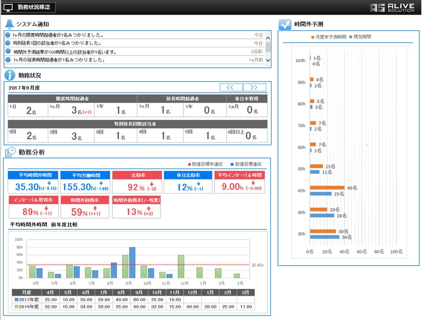 「ALIVE SOLUTION TA」バージョン6.3では、従来強みを持っている遵法管理機能をより一層強化。特に人事総務部門向け機能として労働時間の実績を「分析」し、今後の「予測」を行い、問題を未然に「予防」するポータル画面を新たに追加。また多様化する働き方に向けて各種IoT機器と連携を強化することで、人事総務部門の負荷軽減と労務コンプライアンスの遵守を支援します。