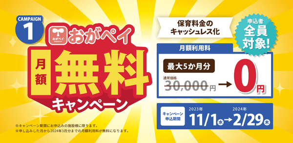 保育料金キャッシュレス決済機能「おがペイ」の月額利用料が最大5カ月分無料(※2)となります。