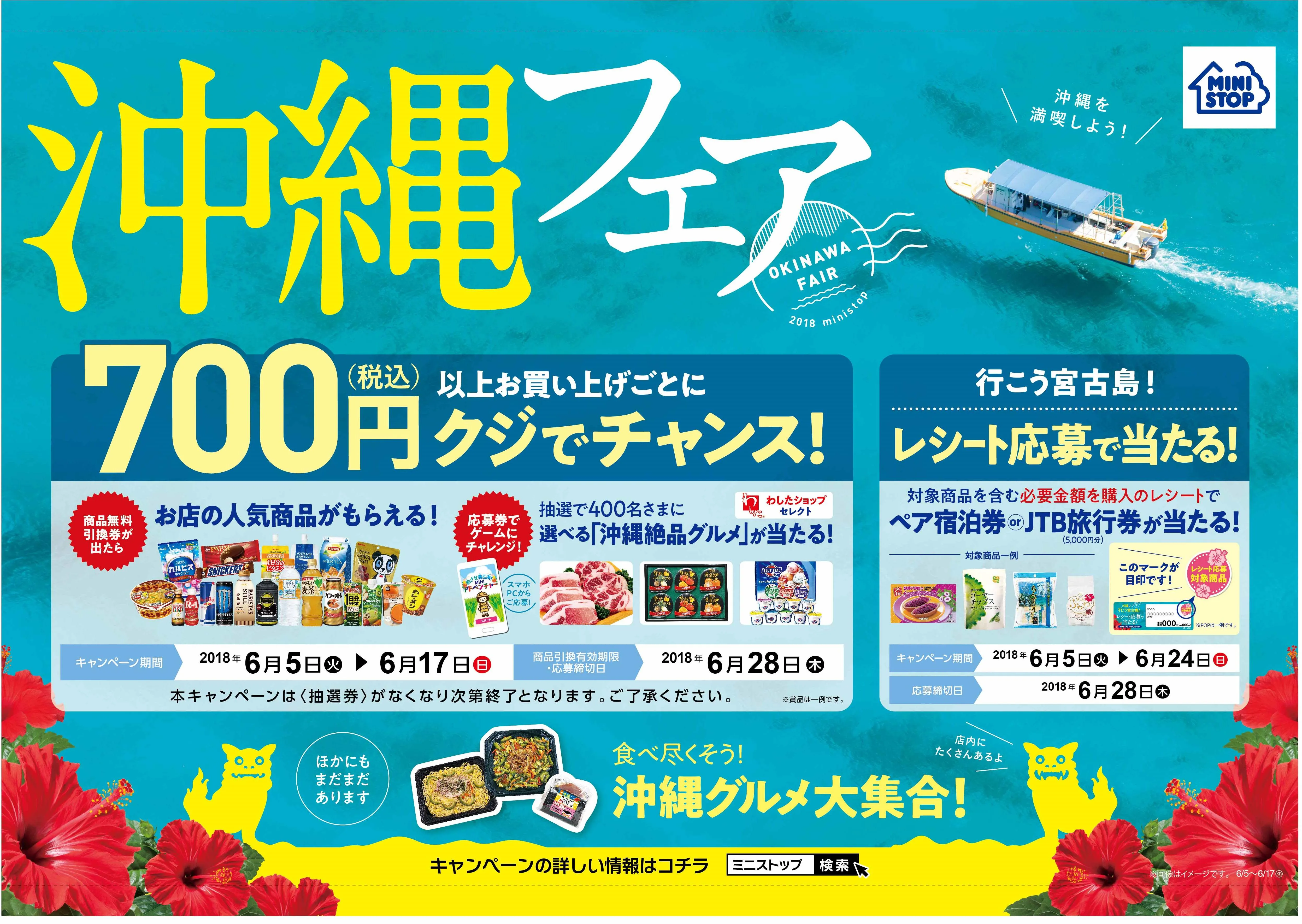 ミニストップ株式会社(本社:千葉県千葉市 代表取締役社長:藤本 明裕、以下:ミニストップ)は、700円(税込)以上のお買い物で店内の人気商品やゲームにチャレンジすると沖縄絶品グルメが当たる“沖縄フェアくじ”を、2018年6月5日(火)より国内のミニストップ店舗(2018年4月末現在:2,247店)にて開催します。