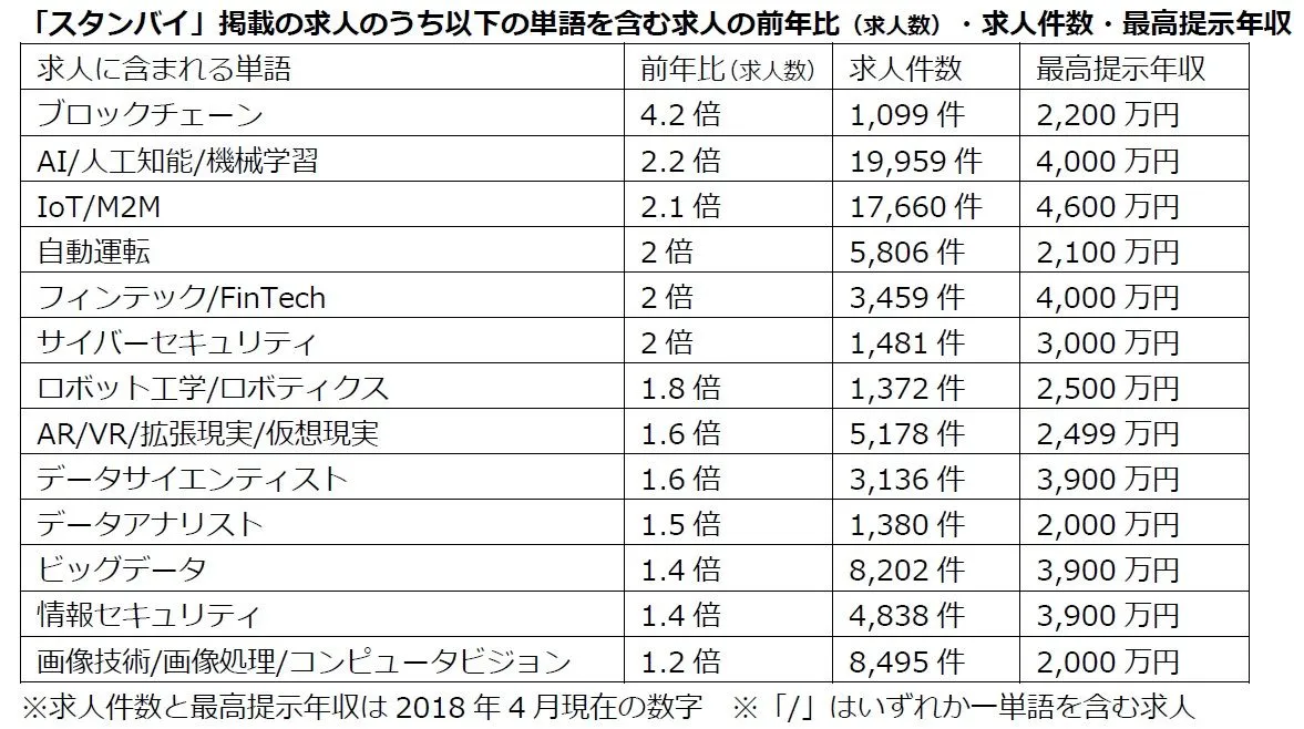 IT人材不足で「ブロックチェーン」求人数 前年比4.2倍 「AI」関連「IoT/M2M」「自動運転」「フィンテック」も2倍 「IoT/M2M」の最高提示年収は4,600万円