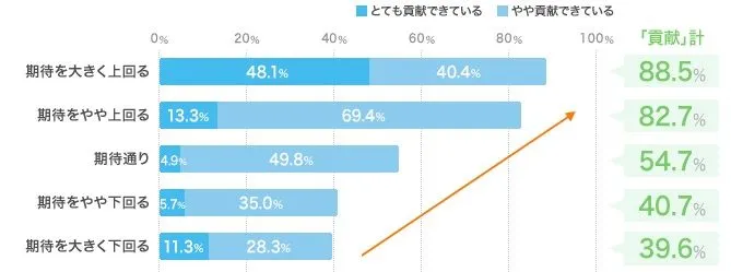 期待ギャップ別に入社企業に対する意識をみると、期待を下回るほど「転職満足度」、「充実度」、「(入社した企業での)継続意向」、「貢献度」は低くなりました。特に「転職満足度」と「継続意向」では、「満足」「継続意向あり」と回答した方は1割未満に留まっています。