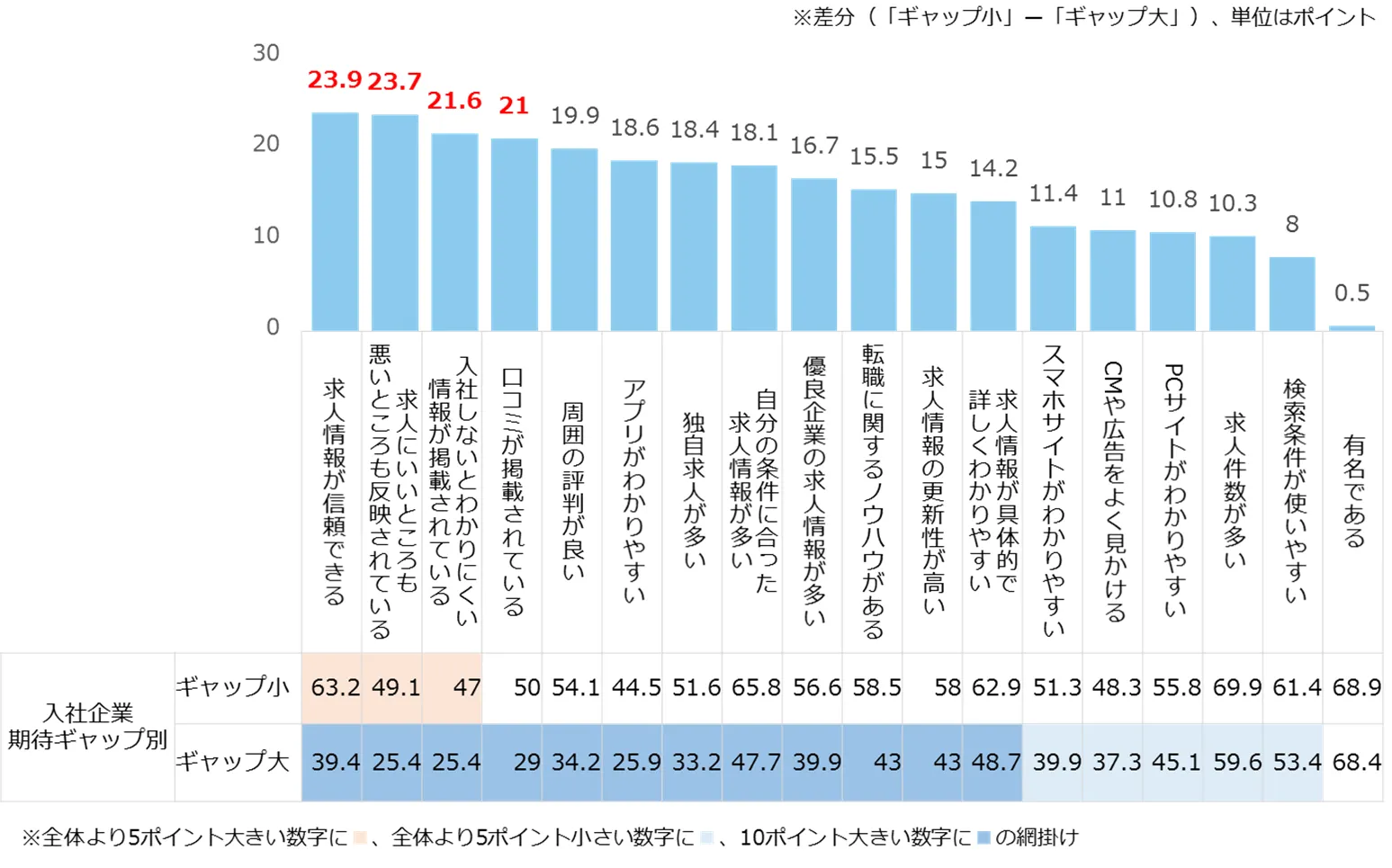 転職が決定したサービスに対する満足度について、期待ギャップの低い層(ギャップ小=期待を大きく上回る+やや上回る+期待通り)と高い層(ギャップ大=期待を大きく下回る+やや下回る)の差分でみたところ、ギャップが大きかった項目は「求人情報が信頼できる」(差分:23.9)「求人にいいところも悪いところも反映されている」(23.7) 、「入社しないとわかりにくい情報が掲載されている」(21.6)、「口コミが掲載されている」(21)でした。期待ギャップの低減には、企業の実態を把握できるような情報の提供が重要と言えます。