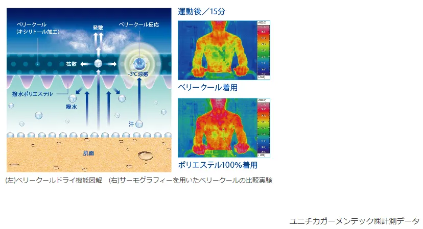 ウェア内を3℃低く保つ「ベリークール」と肌面をドライにする機能を併せ持つ新素材です。生地に配合したキシリトールが汗に反応して熱を吸収。また、汗を素早く吸収・拡散させて乾燥を促進させる生地構造を採用しています。クーリング効果と汗のベタつきのストレスを軽減させることで選手のパフォーマンスを向上させます。