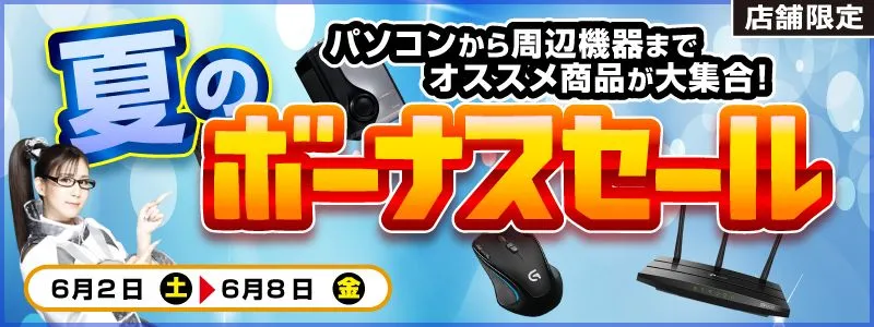 パソコン工房・グッドウィルを運営する株式会社ユニットコム(代表取締役:端田 泰三、本社:大阪市浪速区)は、全国のパソコン工房およびグッドウィル店舗にて、6月2日(土) より「夏のボーナスセール」を開催いたします。パソコンから周辺機器までオススメ商品が大集合! 6月2日(土)・3日(日)限定の特価品もご用意しています。
