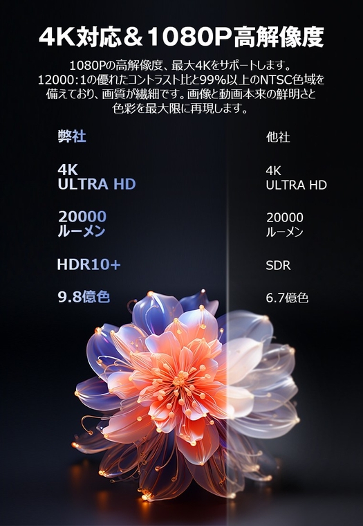 光源性能を見直し、従来の16,000ルーメンから20,000ルーメンへ輝度を向上させました。日中のリビングや照明下でもコントラストのある映像表現を実現し、新生活のさまざまな時間帯に対応します。くっきりとした色再現性で、くつろぎの時間もプレゼンテーション用途も高品質な映像で楽しめます。