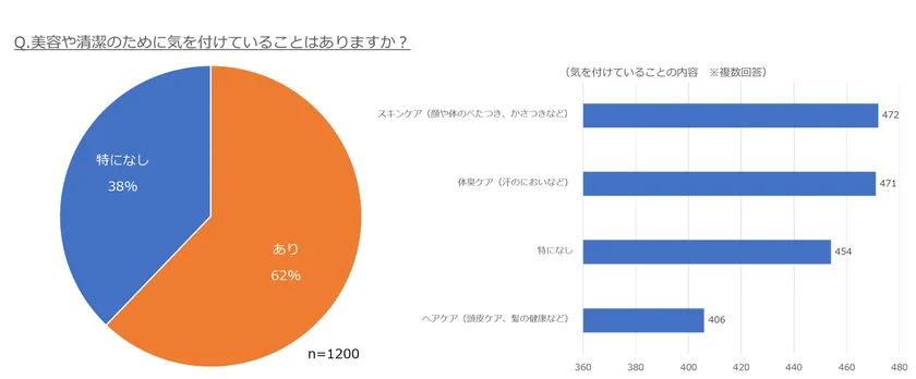 対象者1,200名に対し、「美容や清潔のために気を付けていることはありますか?」と尋ねたところ、特になしと回答した方はわずか38%にとどまり、半数を大幅に上回る62%が、何かしら気を付けていることが分かりました。