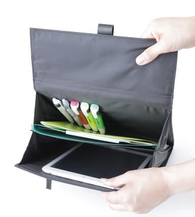 申請書類や資料、タブレット、地図、クリアホルダーなどをスマートに整理できます。トート・リュックなど縦型のバッグにぴったりと収まるサイズで、A4サイズの資料まで入れることが可能。また厚紙を使用した中敷で仕切りをつくり、資料や紙類を傷めずお客様ごとにきれいに収納できます。フラップの開閉部はマグネット仕様にしたことで、必要な時に必要なモノをさっと取り出せます。フラップの開閉部をマグネットにしたことで、面ファスナーを採用している商品が多い中、開閉時のビリビリ音と経年劣化(メス側が毛羽立つ)を防ぐことができます。バッグの中で見失いがちなペン類を収納する専用ホルダーも用意しました。