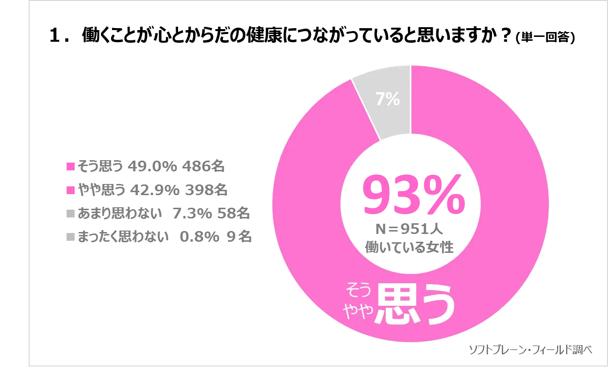 ・働いている女性の9割超が仕事をする(働く)ことが、健康(心とからだ)につながっていると回答。