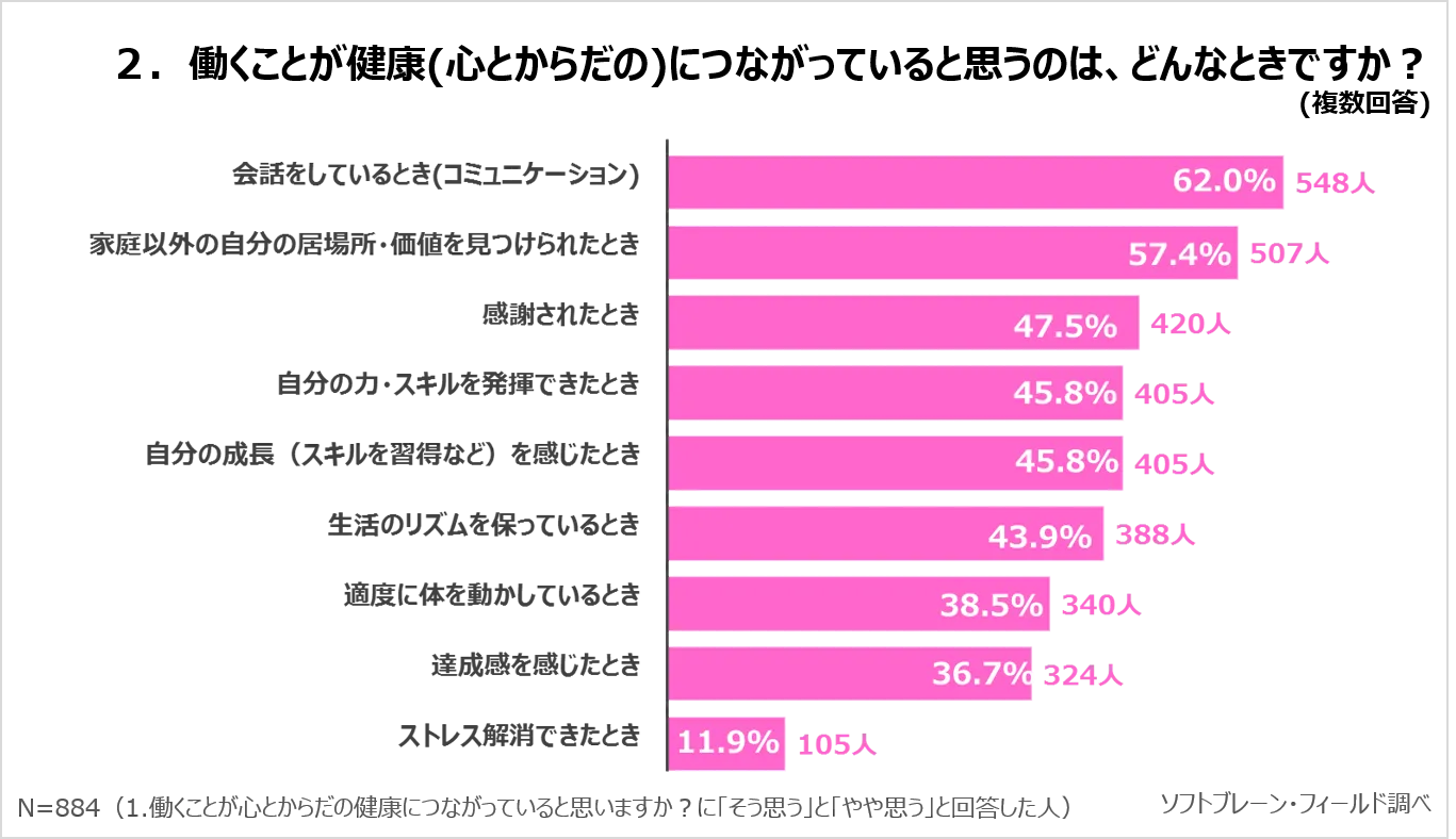 次に、1で働くことが心とからだの健康につながっていると思いますか?に「そう思う」、「やや思う」と回答した人(N=884人)に、実際に働く中でどのような時にそう感じているのかを調査しました。