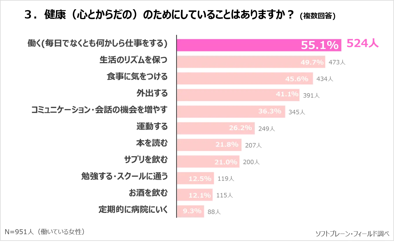 ・健康のためにしていることは、「働く(毎日でなくとも何かしら仕事をする)」が働く女性の半数超という結果となった。