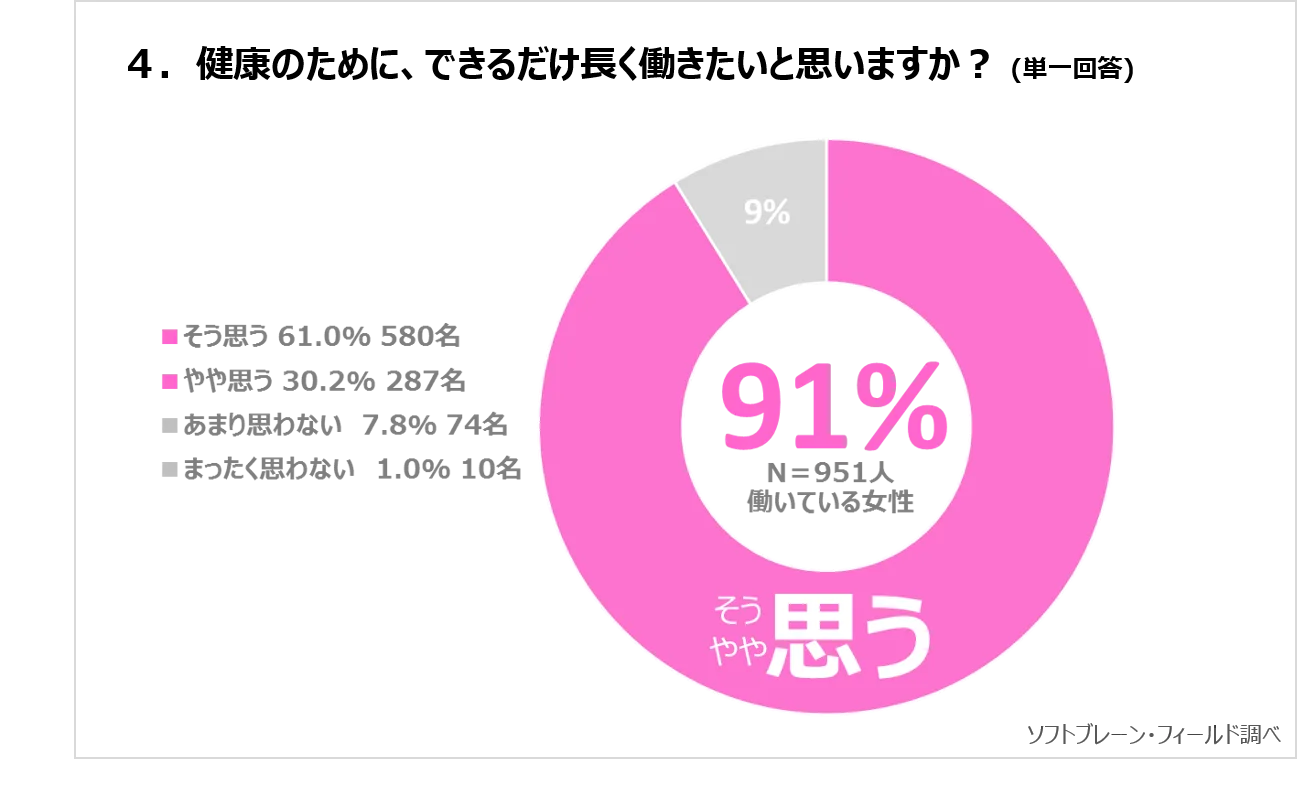 「そう思う」が61.0%、「やや思う」が30.2%、「あまり思わない」が7.8%、「まったく思わない」が1.0%となり、「そう思う」と「やや思う」を合わせ、働いている女性の9割を超える人が「健康のために、できるだけ長く働いていたい」という結果でした。