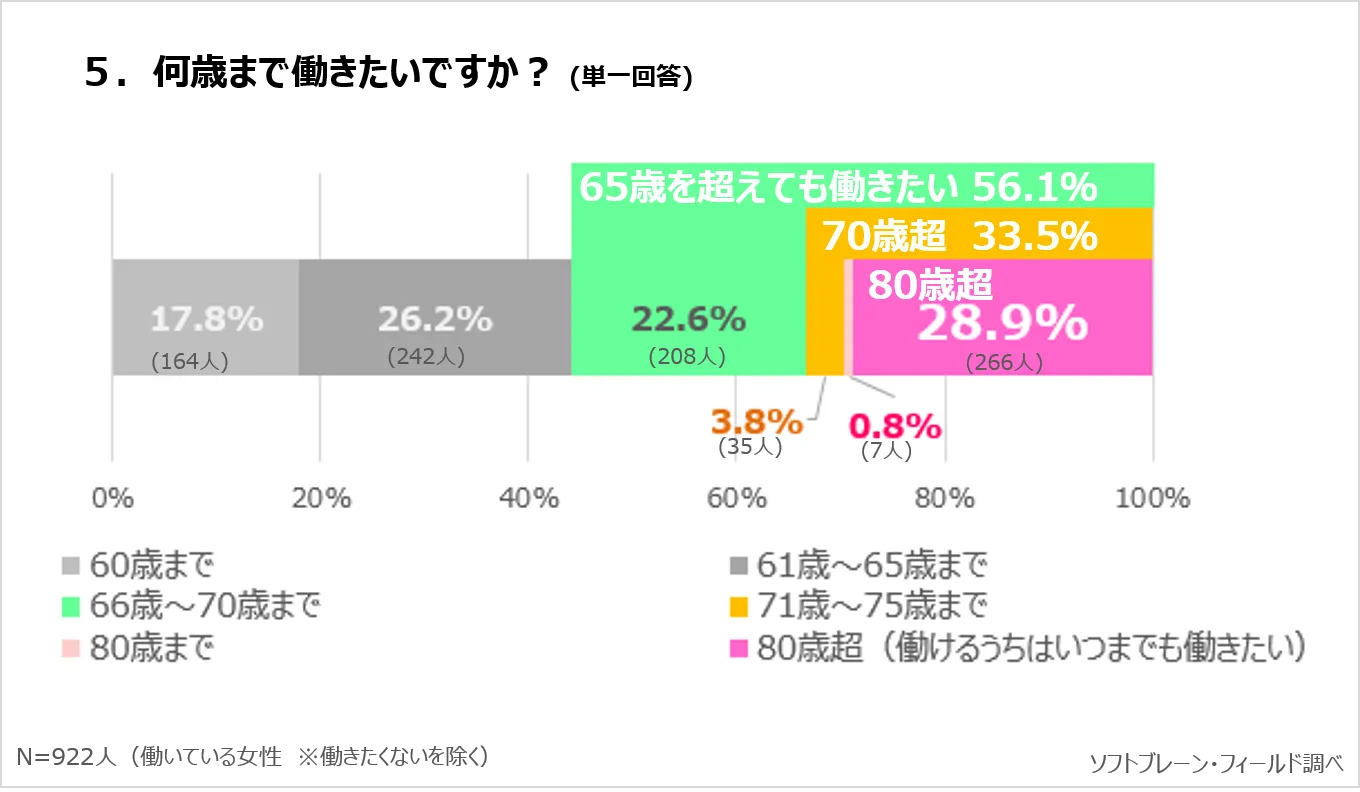 「80歳超(働けるうちはいつまでも働きたい)」が28.9%と最も多く、「61歳~65歳まで」が26.2%、「66歳~70歳まで」が22.6%、「60歳まで」が17.8%と続いた。70歳を超えても働きたいと考える人は33.5%と3割超、65歳を超えても働きたいと考える人は56.1%と半数を超える結果となりました。