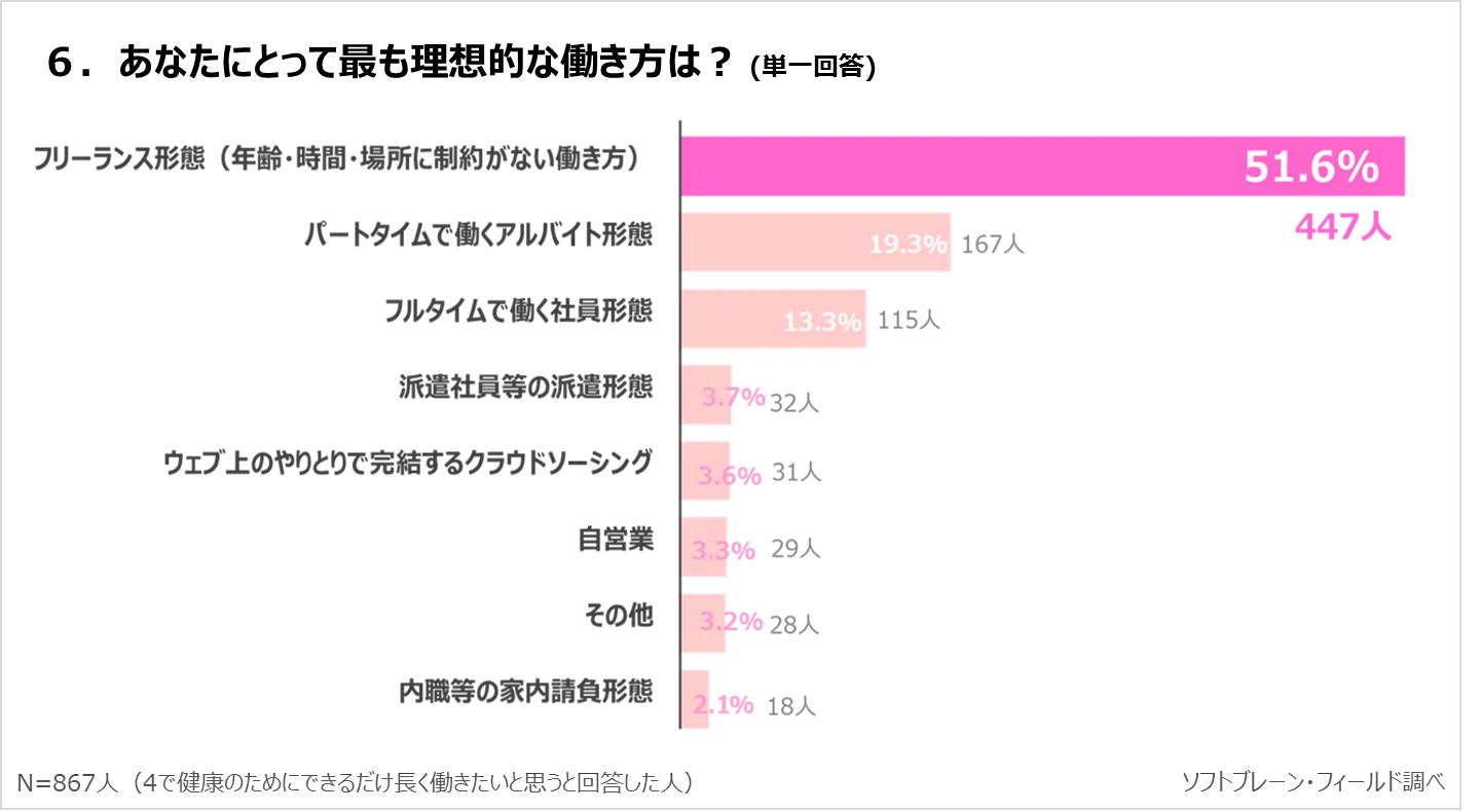 次に、4の健康のために、できるだけ長く働きたいですか?に「そう思う」、「やや思う」と回答した働く女性(N=867人)に、最も理想的な働き方を聞きました。