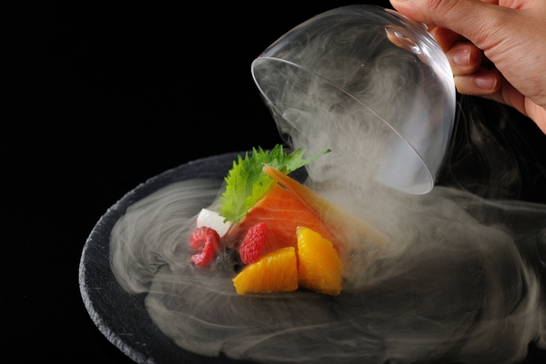 器や提供方法に趣向を凝らし、「アトリエ温泉旅館」というテーマの一端を感じることのできる会席料理を提供をしています。先付は、サーモンと相性の良い季節のフルーツを瞬間燻製した一品「サーモンの瞬間燻製」です。蓋を開けた瞬間に広がる煙は大涌谷の噴煙をイメージしています。