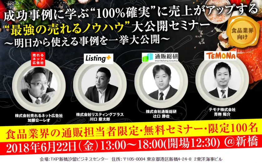 サブスクリプションビジネス支援サービスを提供しているテモナ株式会社(本社:東京都渋谷区、代表取締役社長:佐川隼人、証券コード:3985)は、株式会社売れるネット広告社、株式会社リスティングプラス、株式会社通販総研の3社で、2018年6月22日(金)に食品業界の通販担当者向けに初の共催セミナーを開催します。