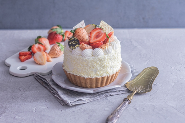甘くやさしい香りの白いちごと大粒のあまおうを贅沢に飾ったタルト。カスタードタルトにふわふわのスポンジを重ね、あまおうをホイップクリームで包みました。