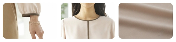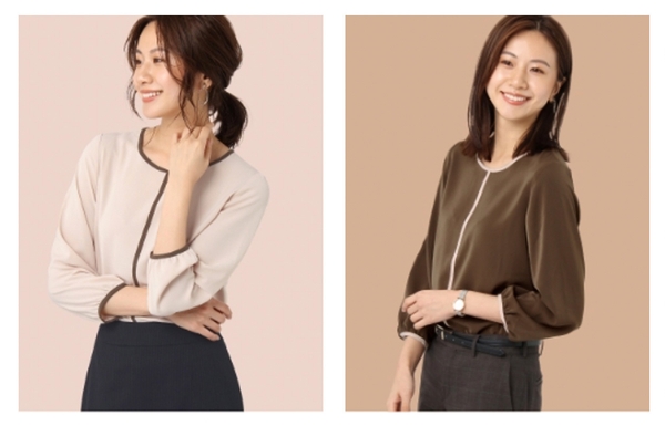 このようにして完成した今回のブラウスは、フロント部や袖口部にパイピングを施したデザインが特徴です。生地とパイピングの配色は要望が最も多かったピンクとブラウンをベースに組み合わせ、「くすみピンク生地にモカのパイピング」と「モカ生地にくすみピンクのパイピング」と、雰囲気の異なる2種類を用意しました。生地には光沢のあるなめらかな風合いのベネシャン素材を使用しています。袖丈の長さや胸元の開き具合などは、ライブの中で上がった声を反映して仕事服として最適なデザインに設定。価格もアンケート結果などを踏まえ、本体2,900円(税込3,190円)というチャレンジ価格で展開します。