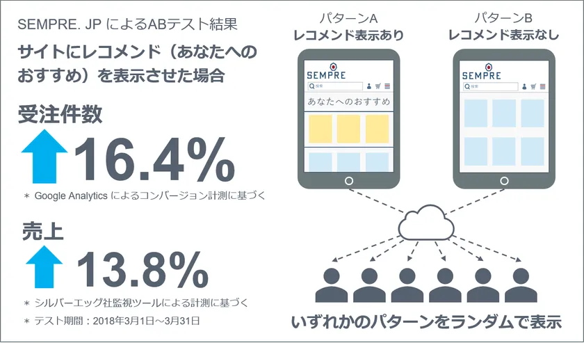 これに際し、所定のAI学習期間を経た2018年3月から1か月間、同社サイトを「レコメンド表示のあるサイト」と「レコメンド表示のないサイト」の2パターンに分け効果を比較するテスト(同時ABテスト)を行ったところ、レコメンド表示のあるサイトでは、無いサイトに比べ受注件数が約16.4%、売上が13.8%向上するという結果が得られたため、これを公開します。