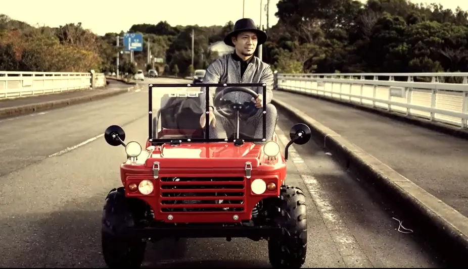 原付ミニカー ネクストスルーザーを展示。ネクストクルーザーは排気量49ccの公道も走れる原付ミニカー登録車。ジープライクな見た目とオフロード仕様のタイヤ、さらにシフトチェンジまで標準装備されたまさに「おとなのオモチャ」です。