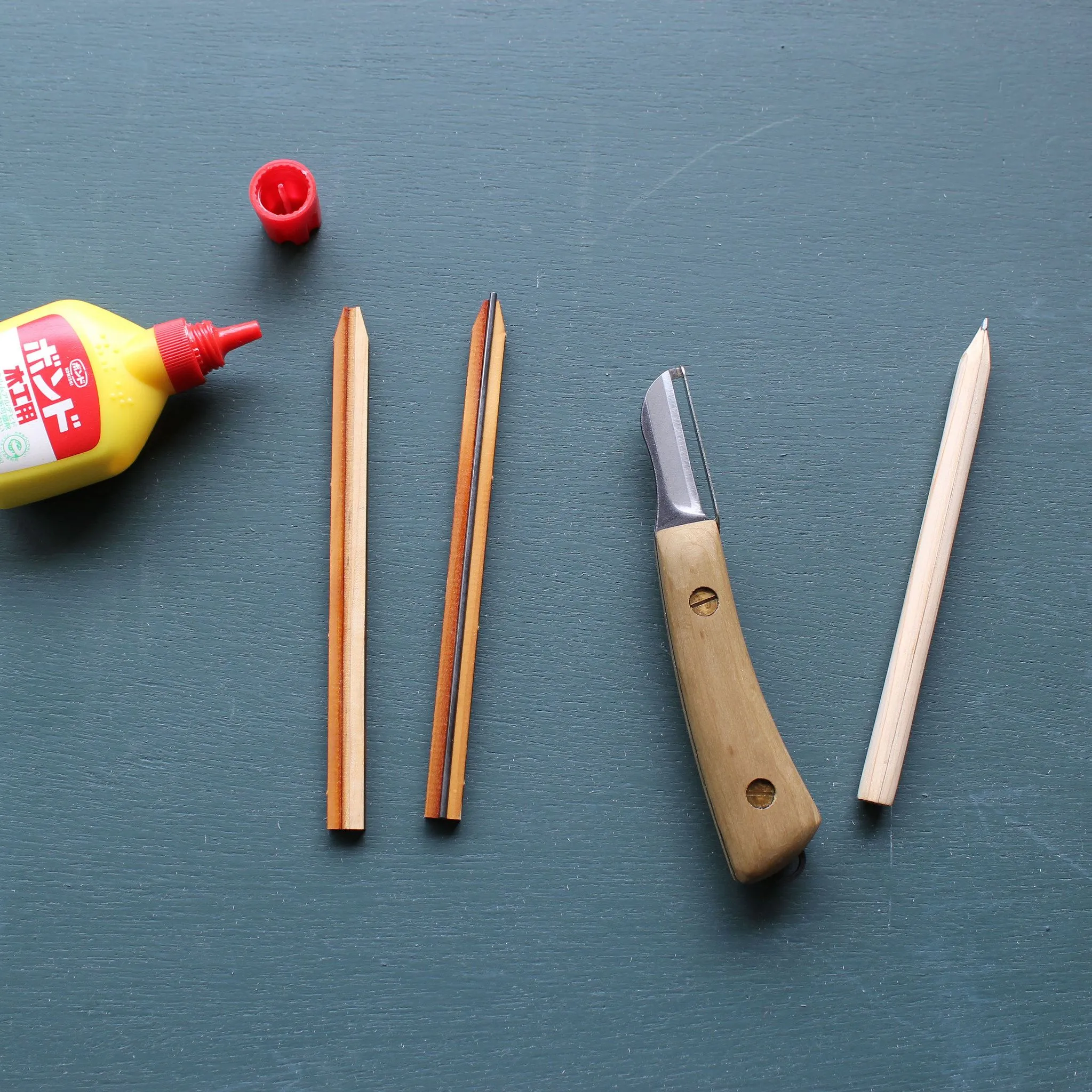 鉛筆とお箸置きづくりを体験!鉛筆づくりは、二つに分かれた木のパーツの間に芯を挟み接着、削り出してお好きな鉛筆の形に整え、最後にやすりがけして完成。お箸置きは木の塊からナイフで削りだし、やすりがけをして完成です。「播州三木は鍛冶屋のまち」として古くから知られる兵庫県三木市で1895年に創業した神沢鉄工。その刃物のクオリティー、ノウハウを駆使し作り上げた、自分だけのナイフを作成するキットシリーズ「It's my knife」は、「削る」ことの楽しさを本質的に味わうことが出来る商品を新たな切り口から意欲的に展開し、クラウドファンディングを皮切りに各方面より注目を集めています。