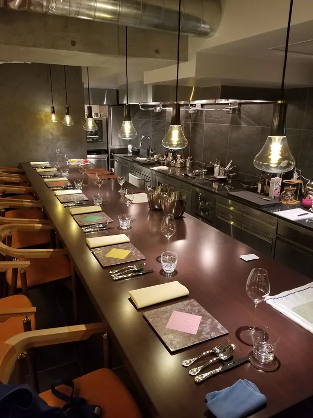 ジョエル・ロブションで20年修行したシェフが奏でる高級食材を使ったフランス料理店。スタッフも全員、三ツ星レストラン経験者で分かりやく、シンプルに素材と向き合っています。大きな一枚カウンター、左官仕上げの壁面、プルーメンのペンダントライトが照らす店内は、まるで茶室の空間。日本人が落ち着くとされている暗めで決して広くない店内の居心地は抜群です。国内外の厳選した椅子、アンティークの家具、食器やカトラリーもこだわりです。