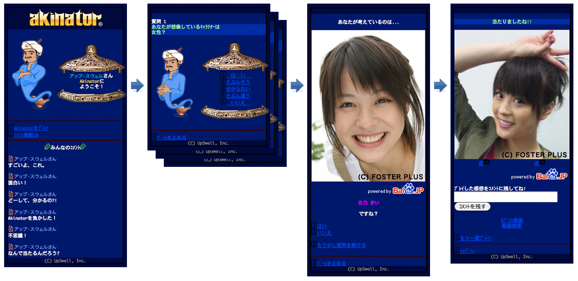 『Akinator』は、ランプの魔人が利用者の思い浮かべた有名スポーツ選手、俳優、モデル、アニメのキャラクターなどをピタリと言い当てるという摩訶不思議な無料会員制エンターテインメントサイトです。利用者はAkinatorが行う簡単な質問に「はい」、「たぶんそう」、「分からない」、「たぶん違う」、「いいえ」の5択から答えていくだけで、Akinatorが誰を想像していたのかを推測します。