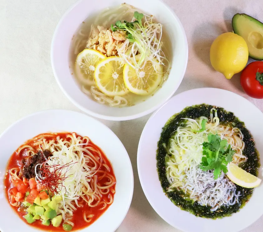 塩レモンの酸味、アボカドトマトの辛味、しらすとあおさのうまみは、夏の食欲増進にぴったりです。「赤」「緑」「黄」の夏らしく涼しげな台湾ヌードル3種。多彩なレパートリーの中で、その時の気分にマッチした一皿をお選びいただけます。