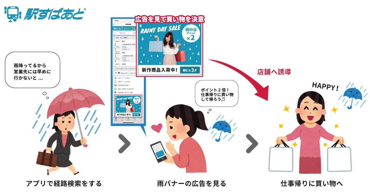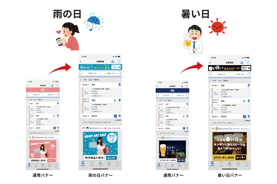 このたび新メニューとして、ユーザーの現在地や出発・到着駅の、天気や気温に合わせた広告配信が可能な「気象連動型広告」の提供を開始します。