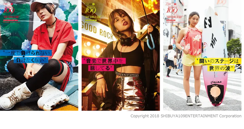 その一環として2018年の4月よりスタートした、SHIBUYA109シーズンビジュアル「GO!GIRLS GO!」において、第1弾としてSHIBUYA109で働くショップスタッフを起用、館内ポスターなどで掲出しました。このシーズンビジュアルは「Making You SHINE!」の更なる実現に向け、「夢に向かって頑張る若者を“輝かせる”」ことを目的に「SHIBUYA109の想いを最も直接的に伝えられる」と考えています。