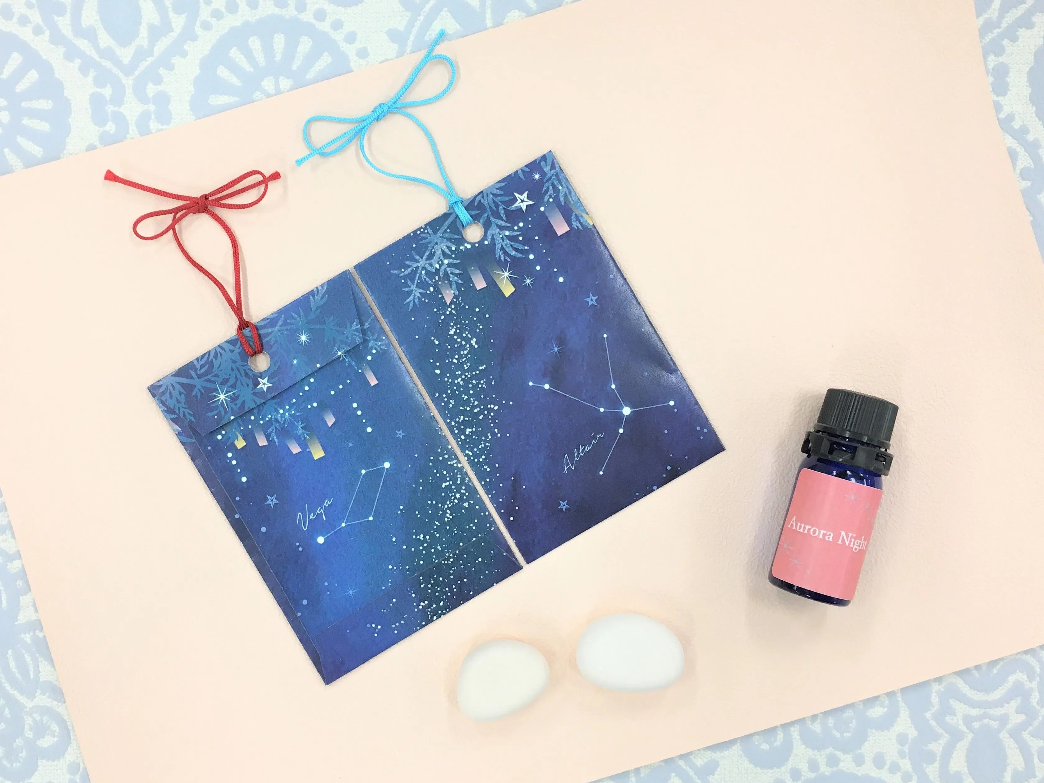 ペア短冊香り袋(2枚)、オリジナルアロマ「Aurora Night」(1本)、ストーン(2個)