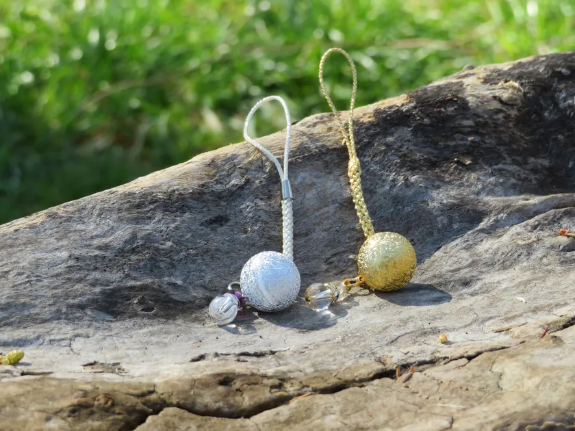 ゴールドの鈴と一緒に定番水琴鈴として展開されています。古くより、銀には「邪気を祓う」といわれていることから、「悪いものをはねのけてくれるように」との思いを込めパワーストーンと組み合わせました。付属チャームに使用しているパワーストーンは、アメジスト4mmと水晶6mmです。
