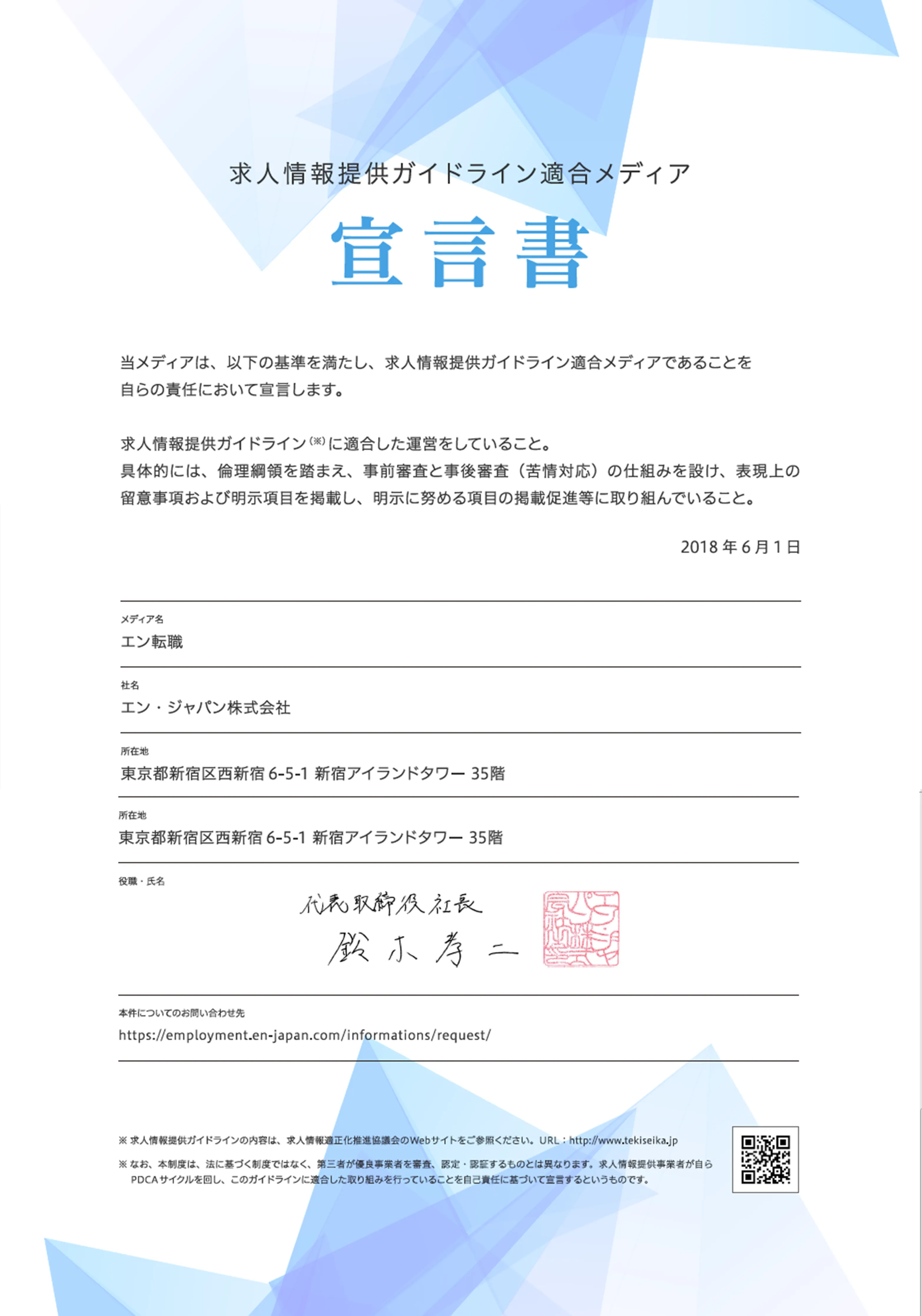 エン・ジャパンが運営する求人サイト7メディア(エン転職、ミドルの転職、 AMBI、エン派遣、エンバイト、エン ウィメンズワーク、女の求人マート)は、求人情報適正化推進協議会が定めたガイドラインを遵守しており、その適合メディアとなる基準を満たしていることから「求人情報提供ガイドライン適合メディア」であることを自らの責任において宣言いたしました。各求人サイトに「宣言書」を設置しております。