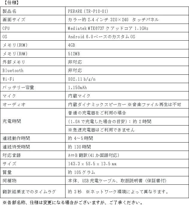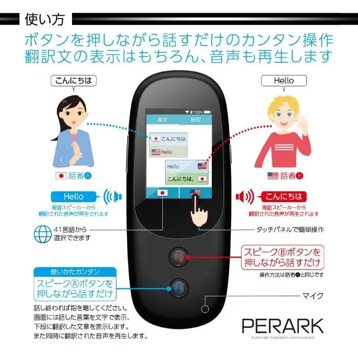 製品名:41か国(地域)の言語に対応した音声自動翻訳機PERARK(ペラーク)