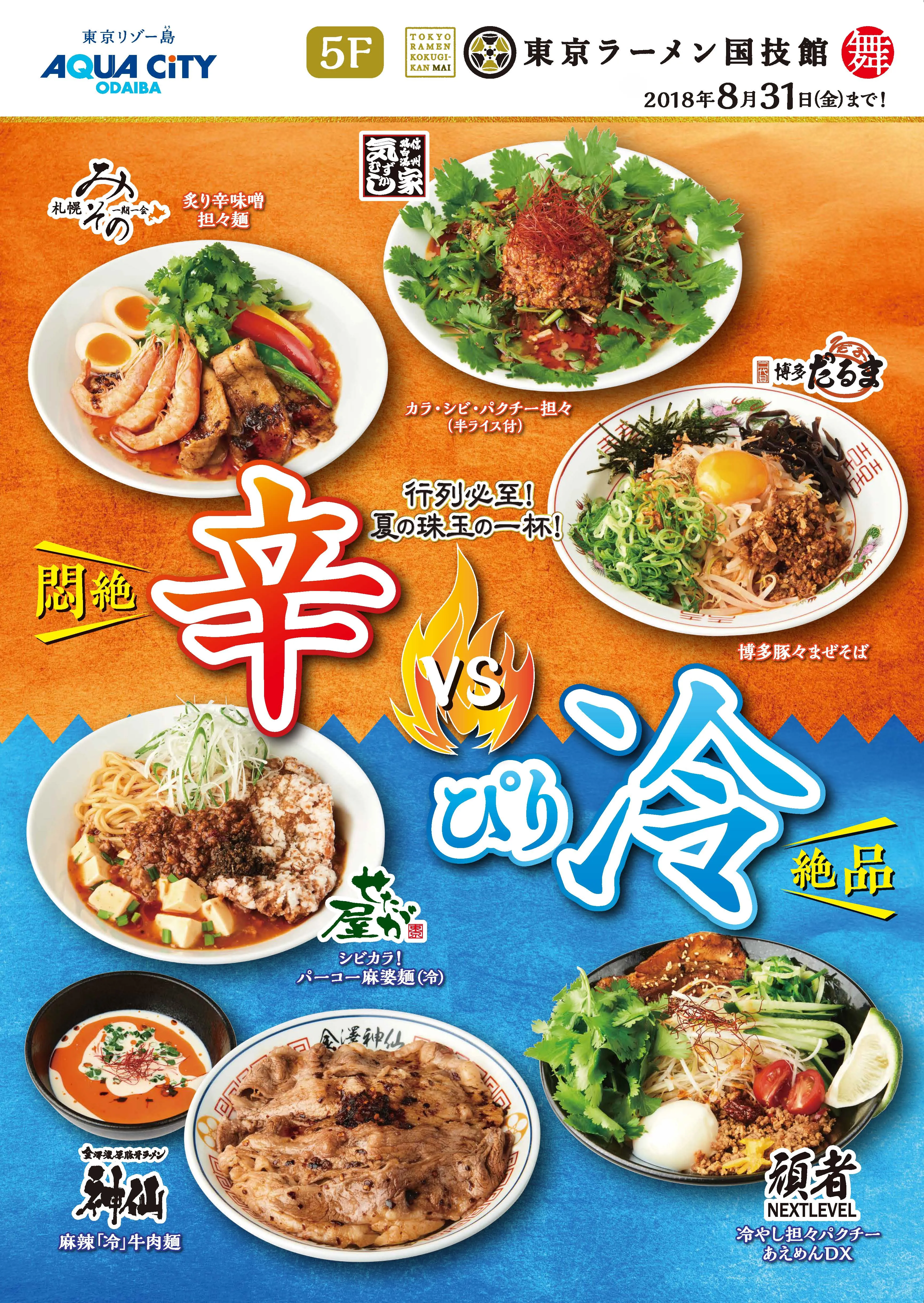 また、6月22日(金)よりアクアシティお台場5F「東京ラーメン国技館 舞」にて、ここでしか食べられない、夏季限定メニューを販売いたします。今年は「悶絶“辛”vs絶品“ぴり冷”」をテーマに、刺激的で食欲をそそる、各店自慢の一皿でお楽しみいただけます。