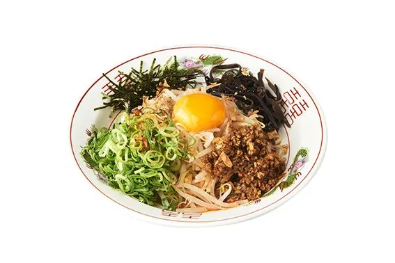 特製辛肉味噌をのせた、“豚々まぜそば”。肉味噌と卵黄を絡め、よく混ぜてお召し上がりください。