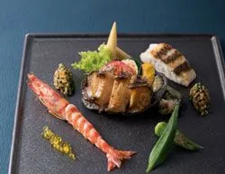 旬の海の魚、川魚を中心に和食の五味・五色を用い、「神戸牛鍬焼き」が入った、夏を感じる焼八寸(会席)です。
