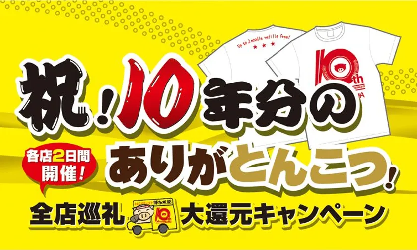 必ずもらえるラーメン無料券&とんこつラーメン特別価格400円、さらに抽選で10周年特別オリジナルグッズをプレゼント。