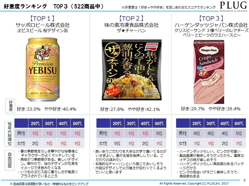 パッケージデザイン開発とマーケティングリサーチを行う株式会社プラグ(東京都千代田区、代表取締役社長:小川 亮)は、この春の新商品522商品を対象に、20~50代男女述べ25,000人にパッケージデザインの好意度調査を実施しました。パッケージデザインを見ると、時代の流れがわかります。“デザイン”がビジネスのキーワードとして注目される中、パッケージデザインのビッグデータから、多くの方に役立つ旬の情報を提供していきたいと考えています。現在期間限定でこれまで調査した3,479商品の中から商品を選んで、調査結果が無料でダウンロードできます( https://www.plug-inc.jp/campaign/201804/free/ )。
