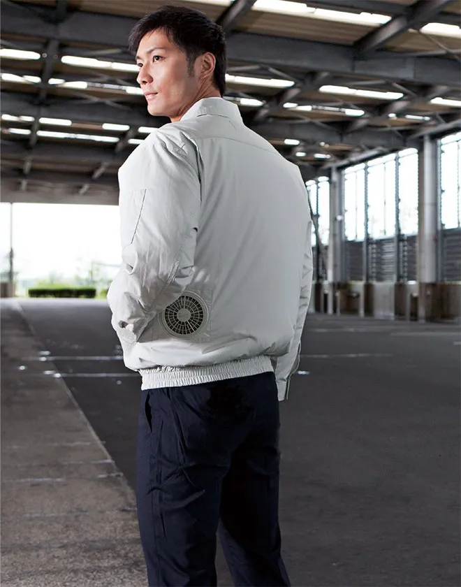 空調服とは、服に付いた小型ファンで服の中に外気を取り入れ、体の表面に大量の風を流すことにより、汗を気化させて、涼しく快適にすごしていただくための商品です。使用するエネルギーもエアコンなどに比べて格段に少なく、環境にも配慮した商品です。工場や屋外作業などエアコンの使用できないような環境でも、快適にすごしていただけるようになります。