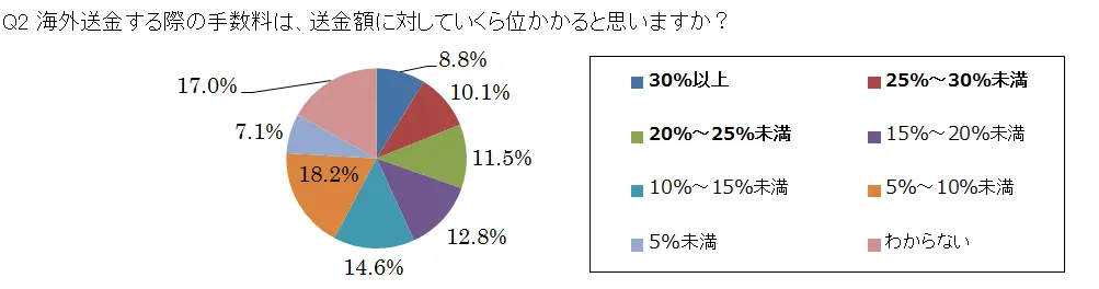 海外送金をする際に「手数料がかかる」と回答した人が62.8%、その内「為替レートに上乗せされている」と回答した人が36.6%と、手数料以外に為替レートに上乗せされた手数料がかかるというイメージを持っている人が多くいました。また手数料の金額については「送金額に対して、5%以上」と回答した人が76.0%、「送金額に対して、20%以上」と回答した人が30.4%と、海外送金には高い手数料がかかるイメージを持っている人が多くいました。実際には、手数料と合わせて為替レートにも上乗せされている為2重の手数料が掛かっているので、約8割の人はその事実を知らないということが見てとれました。