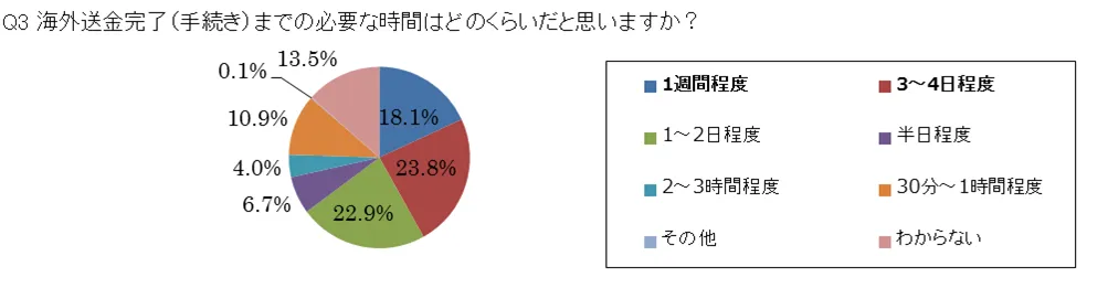 コスト面に続いて、海外送金をする際の手続きに要する期間の意識調査結果も実施しました。海外送金をする際の送金手続きに必要な時間については「1日以上かかる」と回答した人が64.8%、その内「1週間程度かかる」と回答した人が18.1%と、海外送金の手続きにはとても時間がかかるイメージを持っている人が多いという結果に。また、送金から着金までの期間についても「1週間以上かかる」と回答した人が37.7%と、国内で送金手続きが完了してから相手側に届くまでにも長い時間がかかるというイメージを多くの人が持っているという結果となりました。