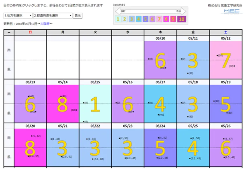 そこで、当社は株式会社気象工学研究所に、「雨」と「風」に関する「過去10年の実況データ」と「1か月先までの予報データ」の活用検討を依頼し、全国61地点を対象に、33日先までの毎日の飛行条件を10段階の総合判定で表示する予報システムの開発に至り、ドローン向けの1か月天気予報を公開してきました。