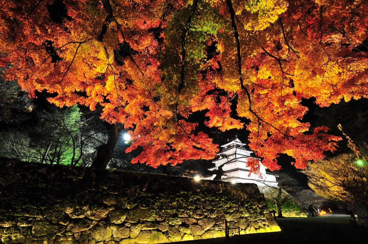公園内にそびえ立つ鶴ヶ城は、「幕末時代の赤瓦をまとった日本で唯一の天守閣がある城」(引用:会津観光ビューロ)で、会津のシンボルとして親しまれています。紅葉と共に天守閣や石垣がライトアップされ、闇夜に照らし出される姿は圧巻です。