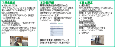 学会でも推奨されている口腔機能や栄養面のチェックを、デイサービスの職員でもテストできるように標準化しています。(テスト資材も身近で入手しやすいものにしています。)