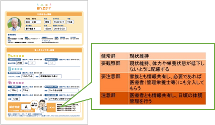 さらにそのテスト結果を、現場の職員がかんたんに記録・データ管理して、食事・栄養状態にリスクがあるかを、上記の研究会が推奨する基準から自動的に判断して、専門職へ報告・連携する帳票やレポートにします。(栄養スクリーニング加算にも対応し、今後は時系列でデータベース化を予定)