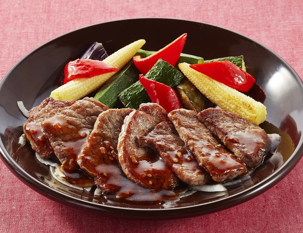 ボリュームたっぷりのカットステーキと夏野菜グリルを和風BBQソースで