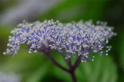 本州(関東以西)・四国・九州の山地に生える落葉低木で、高さは1m~1.5m、花は径5cmほどです。アジサイによく見られる大きな飾り花がないため、他の種に比べてとても小柄ですが、代わりに甘い香りを放ち、花粉を運んでくれる昆虫たちを誘います。花色は、淡青紫色の優しい色合いですが、株により花の色調が微かに違い、青色が濃いものから白に近いものまで様々な色合いがみられます。