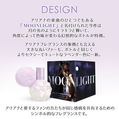 アリアナの楽曲のひとつである『MOONLIGHT』と名付けられた今作は、月の光のようにキラキラと輝いて、角度によって色味が変わる幻想的なボトルが特徴。