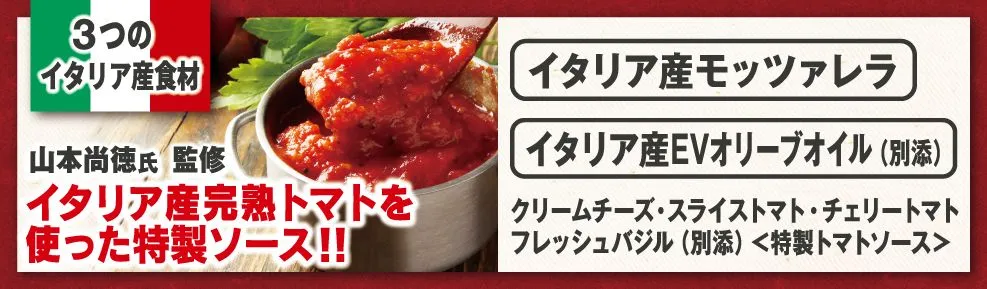 中でもこのピザのために作られた、イタリア産完熟トマトをふんだんに使った特製ソースは、トマト本来の味わいが豊かな濃厚なソースに仕上がっています。