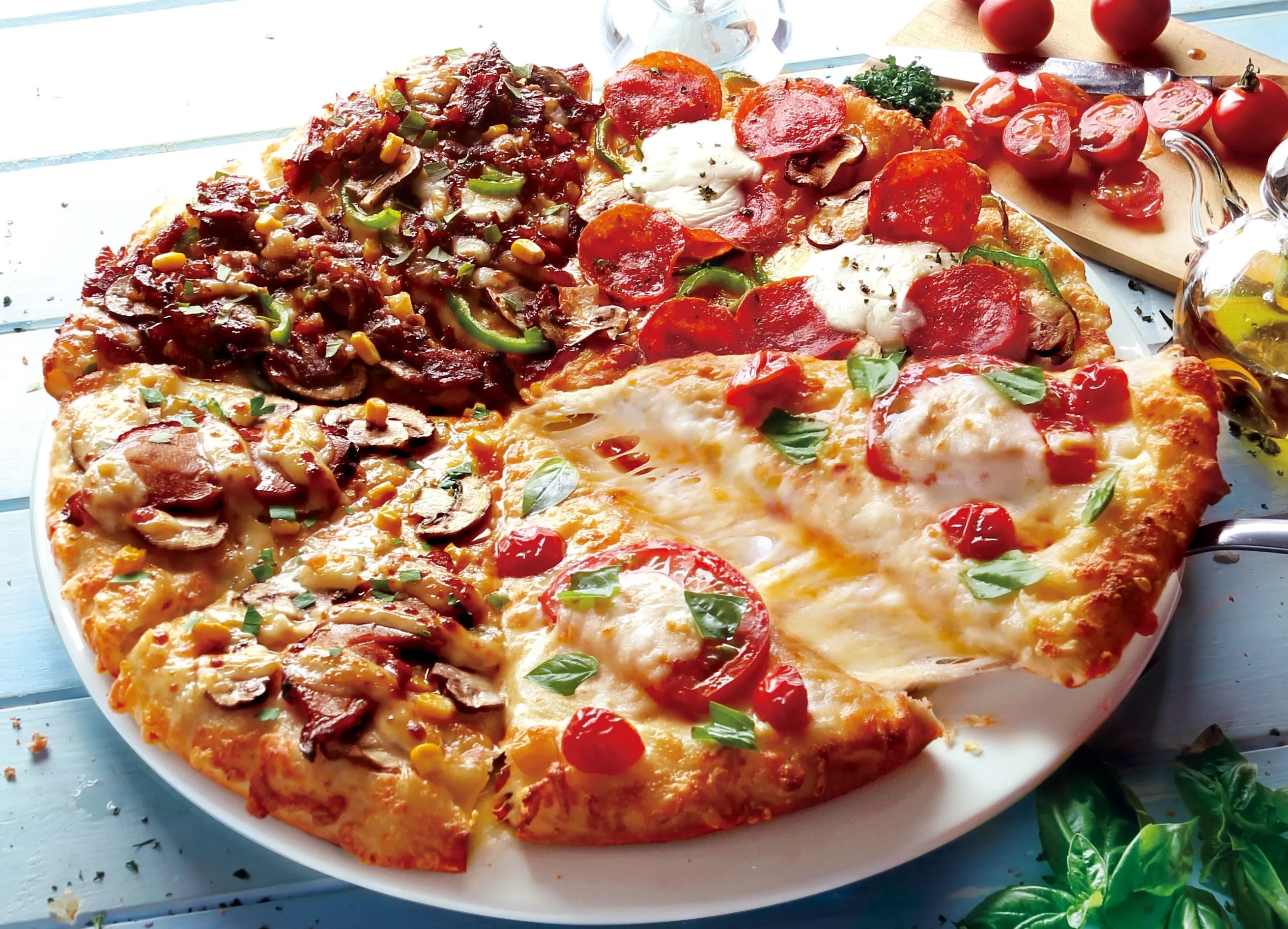 ピッツア職人山本氏が監修した『女王のマルゲリータ』を含む3つの新商品と、ピザーラ不動の人気NO1メニュー『テリヤキチキン』が1枚で楽しめる、この夏だけの特別なクォータピザです。